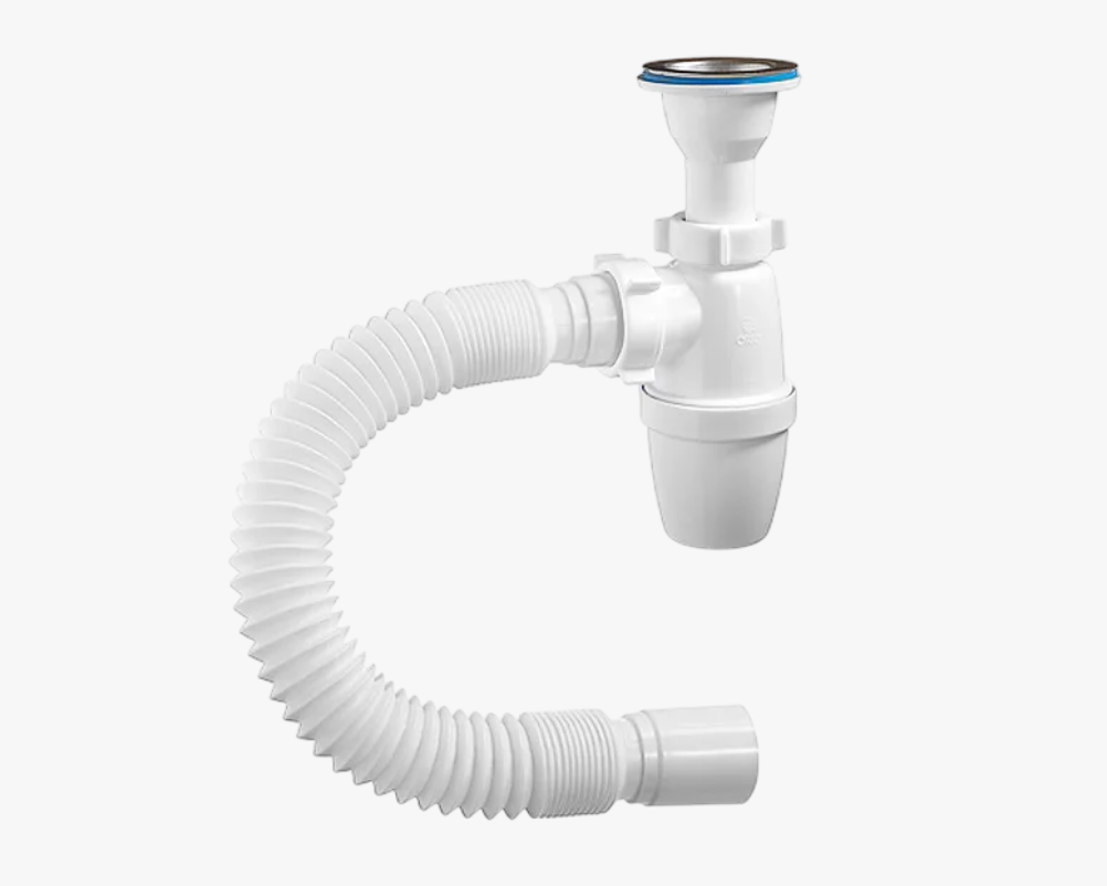 A-32018 Orio ბოთლის სიფონი პატარა კორპუსით, თუჯის გამოსასვლელით 1 1/2 х 40, მოქნილი მილით 40-40